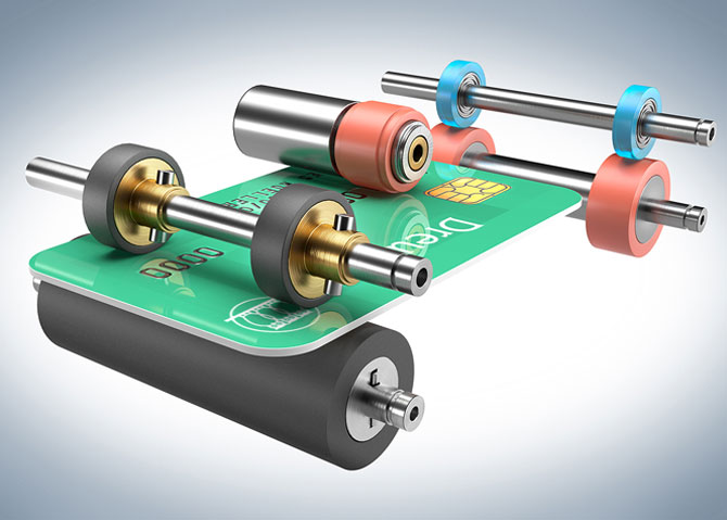 Sollen Papiertickets und Plastikkarten durch denselben Pfad im Gerät laufen, muss die unter-schiedliche Dicke der beiden Medien bedacht werden. Eine Lösung bieten dafür Andruckrol-len mit einem Kugellager. Aufgrund der geringen Einbaumaße der Rollen haben wir Lösungen entwickelt, die Gummierung direkt auf den Außenring des Kugellagers aufzubringen. Auch hierbei können schnittfeste Gummierungen gewählt werden, um Beschädigungen durch Chip-karten mit scharfen Kanten vorzubeugen.